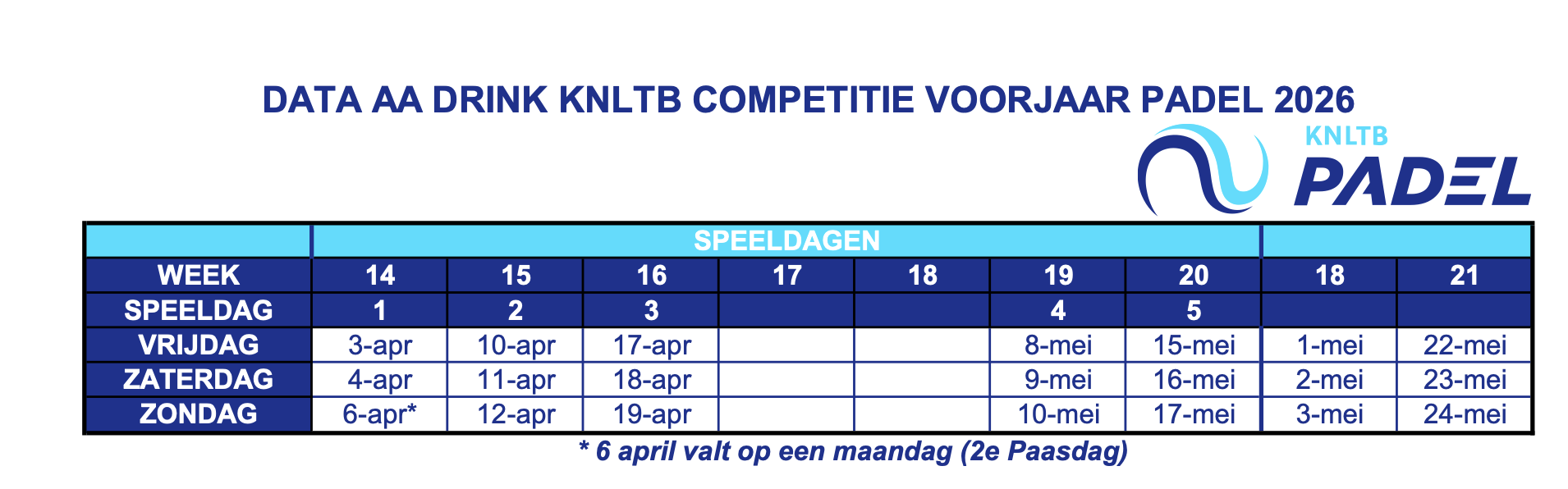 De AA Drink Voorjaarscompetitie Padel wordt gespeeld in april en mei 2026. Klik hier voor de speeldata.